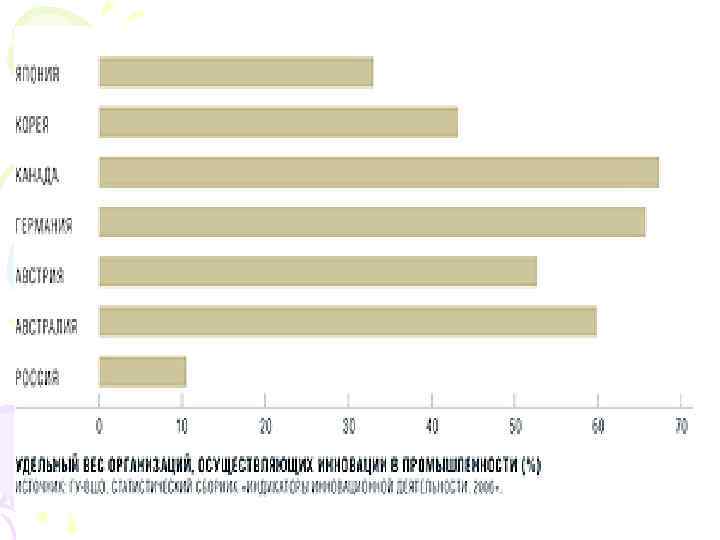 Россия (сильные и слабые инновационные стороны) Mobile phone subscribers (per 100 people) 10 Measure of Trade Barriers- "Tradeweighted average tariff rate" 125 Growth rate of Labour Productivity 16 Regulatory Quality 111 Researchers in R&D Per Million of Population 19 Intensity of local competition 104 … Number of Patents … 29 Intellectual property protection 101