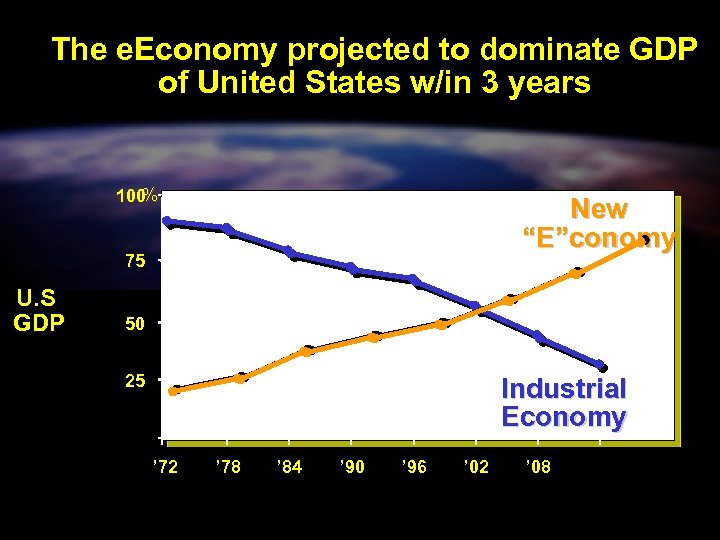 The e. Economy projected to dominate GDP of United States w/in 3 years % 100 New “E”conomy 75 U. S. GDP 50 25 Industrial Economy 0 ’ 72 ’ 78 ’ 84 ’ 90 ’ 96 ’ 02 ’ 08
