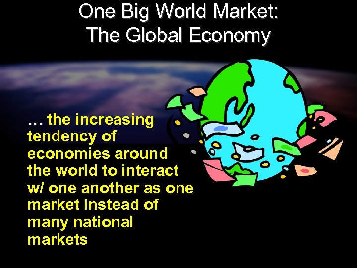 One Big World Market: The Global Economy … the increasing tendency of economies around the world to interact w/ one another as one market instead of many national markets