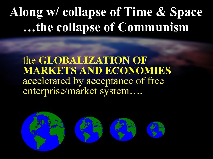 Along w/ collapse of Time & Space …the collapse of Communism the GLOBALIZATION OF MARKETS AND ECONOMIES accelerated by acceptance of free enterprise/market system….