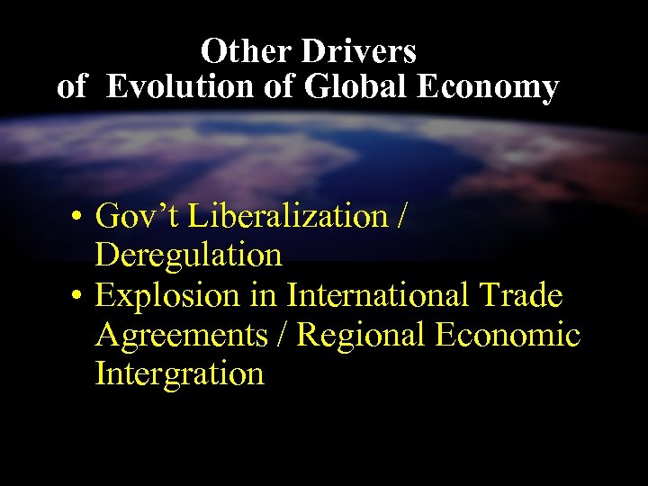 Other Drivers of Evolution of Global Economy • Gov’t Liberalization / Deregulation • Explosion in International Trade Agreements / Regional Economic Intergration