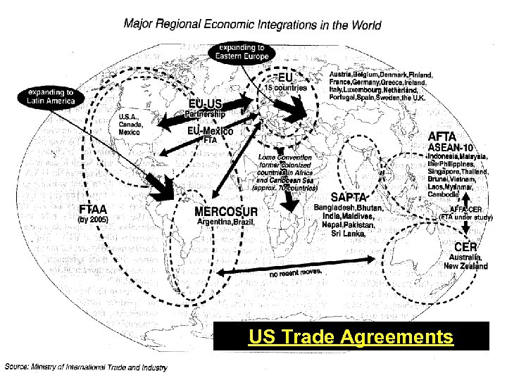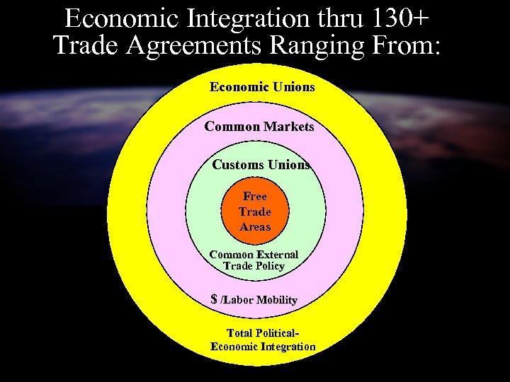 Economic Integration thru 130+ Trade Agreements Ranging From: Economic Unions Common Markets Customs Unions Free Trade Areas Common External Trade Policy $ /Labor Mobility Total Political. Economic Integration