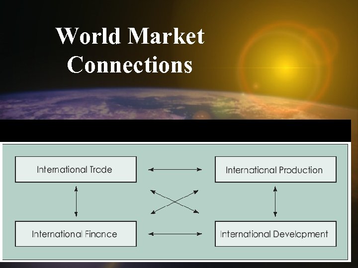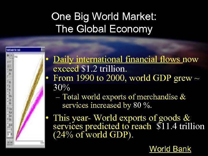 One Big World Market: The Global Economy • Daily international financial flows now exceed $1. 2 trillion. • From 1990 to 2000, world GDP grew ~ 30% – Total world exports of merchandise & services increased by 80 %. • This year- World exports of goods & services predicted to reach $11. 4 trillion (24% of world GDP). World Bank