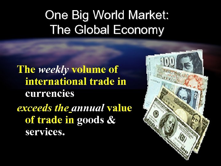 One Big World Market: The Global Economy The weekly volume of international trade in currencies exceeds the annual value of trade in goods & services.