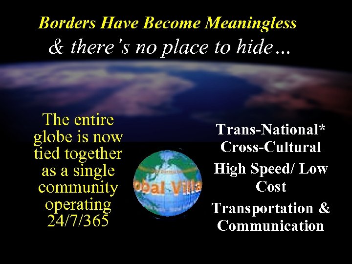 Borders Have Become Meaningless & there’s no place to hide… The entire globe is now tied together as a single community operating 24/7/365 Trans-National* Cross-Cultural High Speed/ Low Cost Transportation & Communication