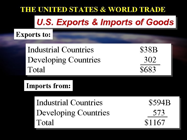 THE UNITED STATES & WORLD TRADE U. S. Exports & Imports of Goods Exports to: Industrial Countries Developing Countries Total $38 B 302 $683 Imports from: Industrial Countries Developing Countries Total $594 B 573 $1167