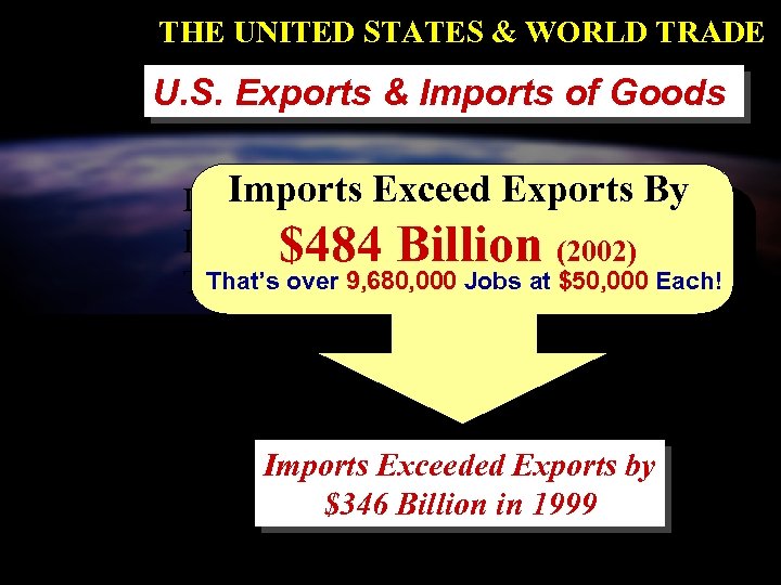 THE UNITED STATES & WORLD TRADE U. S. Exports & Imports of Goods Imports Exceed Industrial Countries Exports By $381 Developing Countries $484 Billion (2002) 301 That’s Each! Total over 9, 680, 000 Jobs at $50, 000 $683 Industrial Countries $594 Developing Countries 573 Imports Exceeded Exports by Total $1167 $346 Billion in 1999