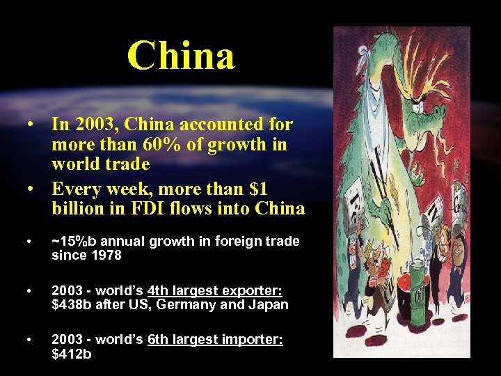 China • In 2003, China accounted for more than 60% of growth in world trade • Every week, more than $1 billion in FDI flows into China • ~15%b annual growth in foreign trade since 1978 • 2003 - world’s 4 th largest exporter: $438 b after US, Germany and Japan • 2003 - world’s 6 th largest importer: $412 b