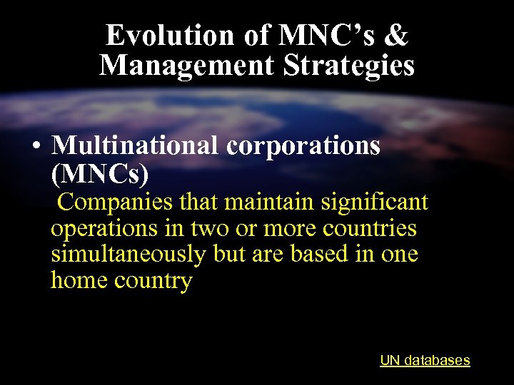 Evolution of MNC’s & Management Strategies • Multinational corporations (MNCs) Companies that maintain significant operations in two or more countries simultaneously but are based in one home country n. UN databases