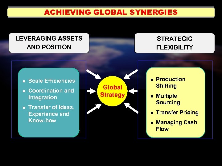 ACHIEVING GLOBAL SYNERGIES LEVERAGING ASSETS AND POSITION n n n Scale Efficiencies Coordination and Integration Transfer of Ideas, Experience and Know-how STRATEGIC FLEXIBILITY n Global Strategy n n n Production Shifting Multiple Sourcing Transfer Pricing Managing Cash Flow