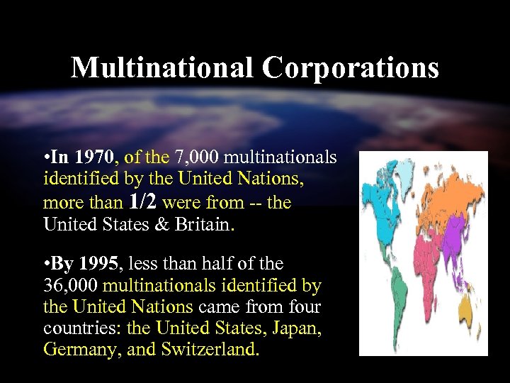 Multinational Corporations • In 1970, of the 7, 000 multinationals identified by the United Nations, more than 1/2 were from -- the United States & Britain. • By 1995, less than half of the 36, 000 multinationals identified by the United Nations came from four countries: the United States, Japan, Germany, and Switzerland.