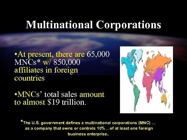 Multinational Corporations • At present, there are 65, 000 MNCs* w/ 850, 000 affiliates in foreign countries • MNCs’ total sales amount to almost $19 trillion. *The U. S. government defines a multinational corporations (MNC) … as a company that owns or controls 10%. . of at least one foreign business enterprise.