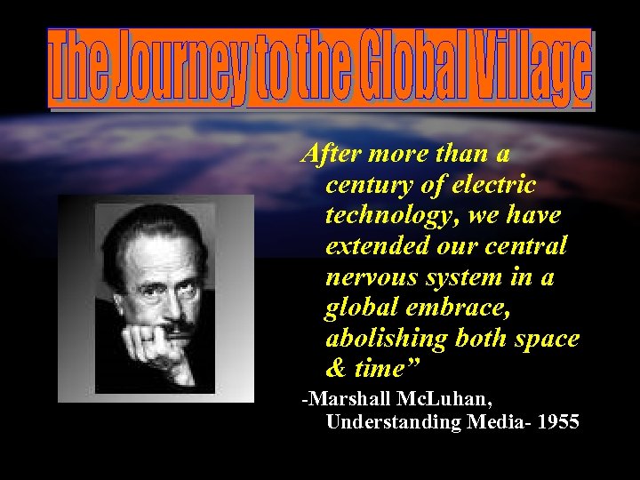 After more than a century of electric technology, we have extended our central nervous system in a global embrace, abolishing both space & time” -Marshall Mc. Luhan, Understanding Media- 1955
