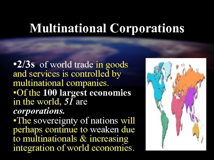 Multinational Corporations • 2/3 s of world trade in goods and services is controlled by multinational companies. • Of the 100 largest economies in the world, 51 are corporations. • The sovereignty of nations will perhaps continue to weaken due to multinationals & increasing integration of world economies.