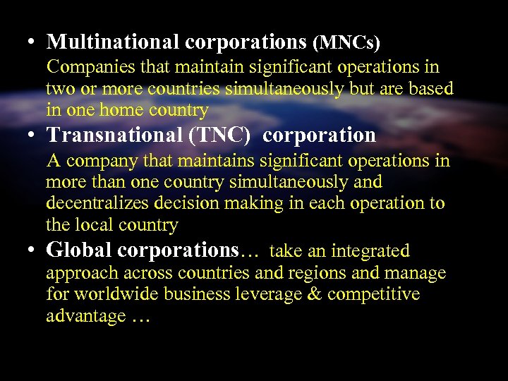• Multinational corporations (MNCs) Companies that maintain significant operations in two or more countries simultaneously but are based in one home country • Transnational (TNC) corporation A company that maintains significant operations in more than one country simultaneously and decentralizes decision making in each operation to the local country • Global corporations… take an integrated approach across countries and regions and manage for worldwide business leverage & competitive advantage …