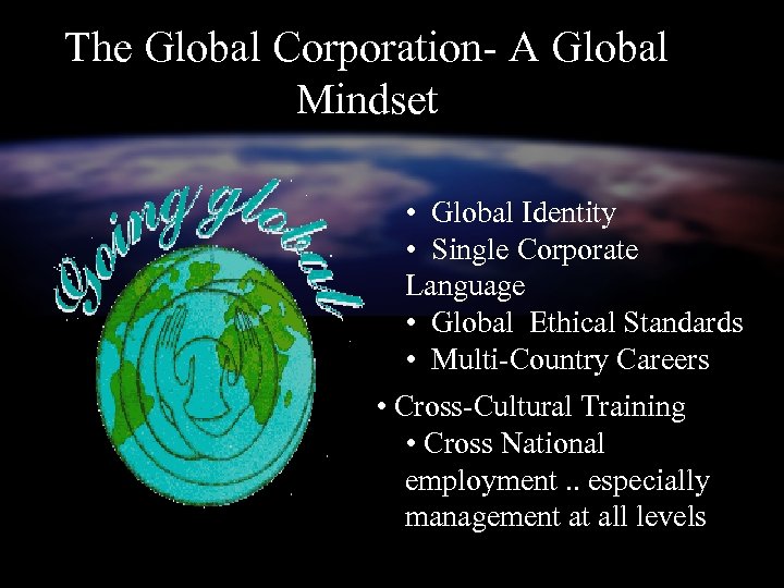 The Global Corporation- A Global Mindset • Global Identity • Single Corporate Language • Global Ethical Standards • Multi-Country Careers • Cross-Cultural Training • Cross National employment. . especially management at all levels