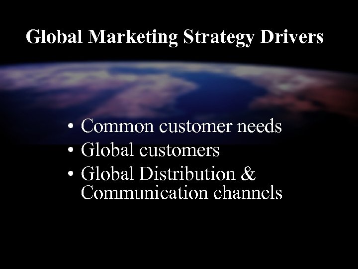 Global Marketing Strategy Drivers • Common customer needs • Global customers • Global Distribution & Communication channels