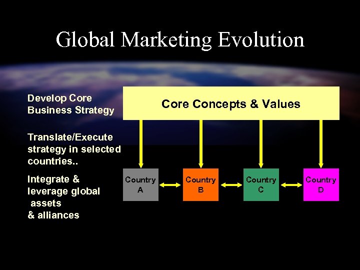 Global Marketing Evolution Develop Core Business Strategy Core Concepts & Values Translate/Execute strategy in selected countries. . Integrate & leverage global assets & alliances Country A Country B Country C Country D