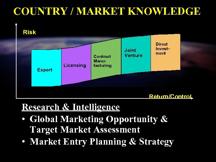 COUNTRY / MARKET KNOWLEDGE Risk Export Licensing Contract Manufacturing Joint Venture Direct Investment Return/Control Research & Intelligence • Global Marketing Opportunity & Target Market Assessment • Market Entry Planning & Strategy