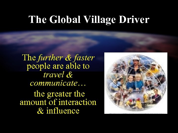 The Global Village Driver The further & faster people are able to travel & communicate… the greater the amount of interaction & influence