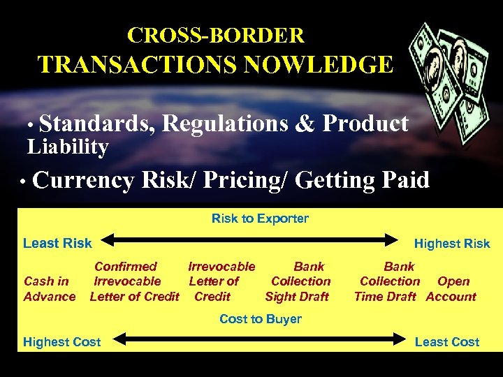 CROSS-BORDER TRANSACTIONS NOWLEDGE • Standards, Liability • Currency Regulations & Product Risk/ Pricing/ Getting Paid Risk to Exporter Least Risk Cash in Advance Highest Risk Confirmed Irrevocable Bank Irrevocable Letter of Collection Letter of Credit Sight Draft Bank Collection Open Time Draft Account Cost to Buyer Highest Cost Least Cost