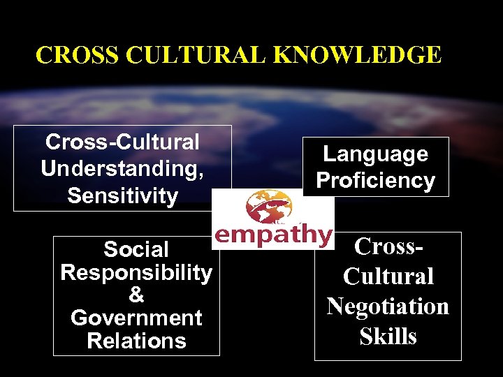 CROSS CULTURAL KNOWLEDGE Cross-Cultural Understanding, Sensitivity Social Responsibility & Government Relations Language Proficiency Cross. Cultural Negotiation Skills