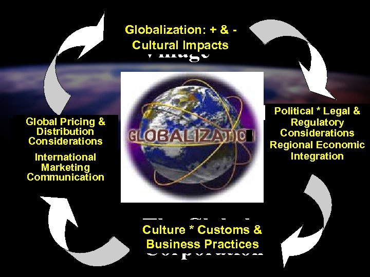 Globalization: + The Global& Cultural Impacts Village Global Marketing Strategy Global WEEK: NEXT Pricing & Distribution Globalization: As Considerations a Business & International Marketing Strategy Communication Political * Legal & The Global Regulatory Considerations Economy Regional Economic Integration The Global & Culture * Customs Business Practices Corporation