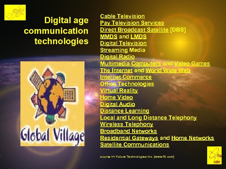 Digital age communication technologies Cable Television Pay Television Services Direct Broadcast Satellite [DBS] MMDS and LMDS Digital Television Streaming Media Digital Radio Multimedia Computers and Video Games The Internet and World Wide Web Internet Commerce Office Technologies Virtual Reality Home Video Digital Audio Distance Learning Local and Long Distance Telephony Wireless Telephony Broadband Networks Residential Gateways and Home Networks Satellite Communications source >> Future Technologies Inc. [www. fti. com]