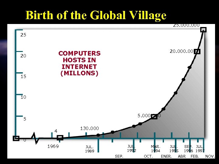 Birth of the Global Village 25. 000 25 20. 000 COMPUTERS HOSTS IN INTERNET (MILLONS) 20 15 10 5. 000 5 4 130. 000 0 1969 JUL. 1992 JUL. 1989 SEP. 1991 MAR. JUL. SEP. JUL. 1994 1995 1996 1997 OCT. ENER. ABR FEB. NOV. 1993 1995 1996 1997