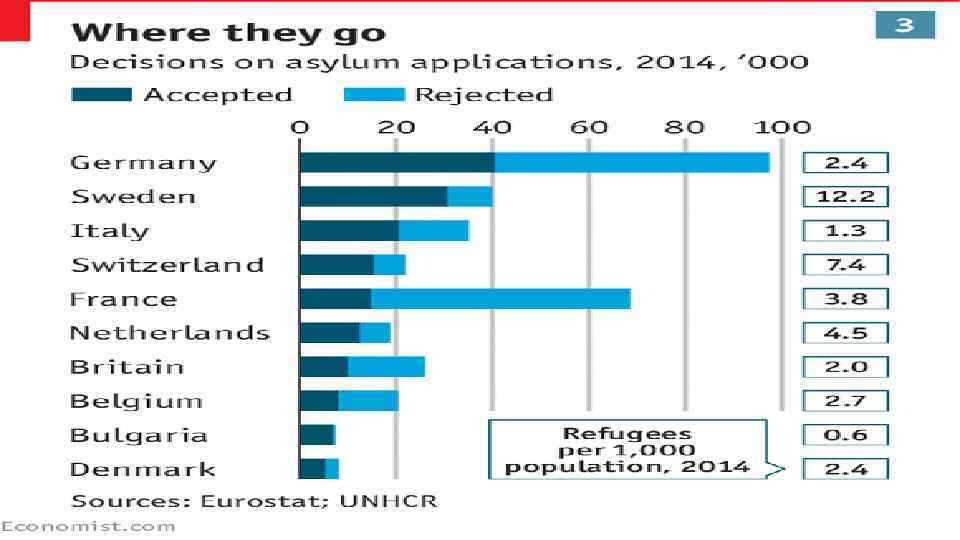 Authorities are struggling to cope as most people cross to a handful of small islands situated kilometers from the Turkish coast. Some 23, 000 have arrived in the past week, 50% more than the previous week. The majority of recent migrants are fleeing from Syria and Afghanistan. Most people will journey further north to seek asylum in countries like Germany, which accepts most asylum-seekers in total, and Sweden, which takes in most as a share of its own population. Germany expects at least 800, 000 asylum-seekers this year compared with 173, 000 in 2014.