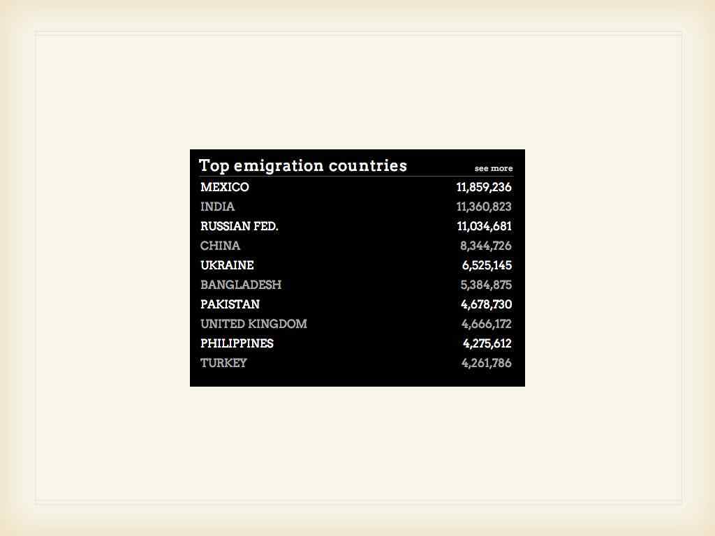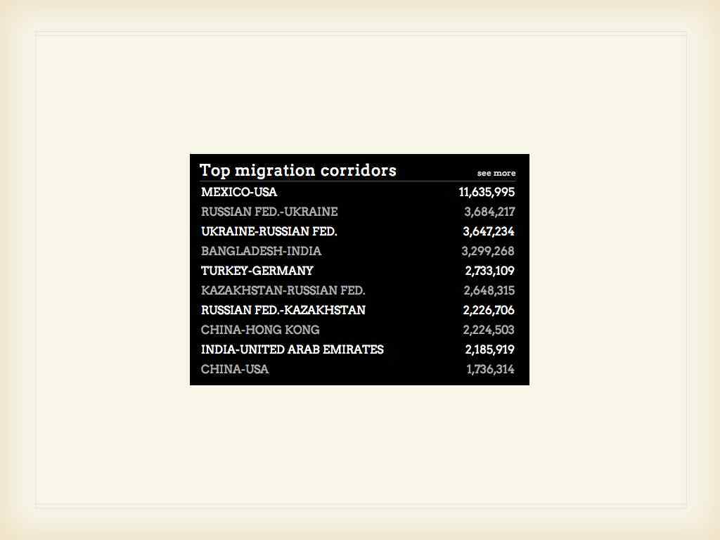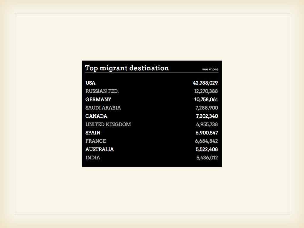 Migrants in the World • • • 3, 15 % of the world population almost 217 million 6 853 328 460 215 738 325 almost 215 million