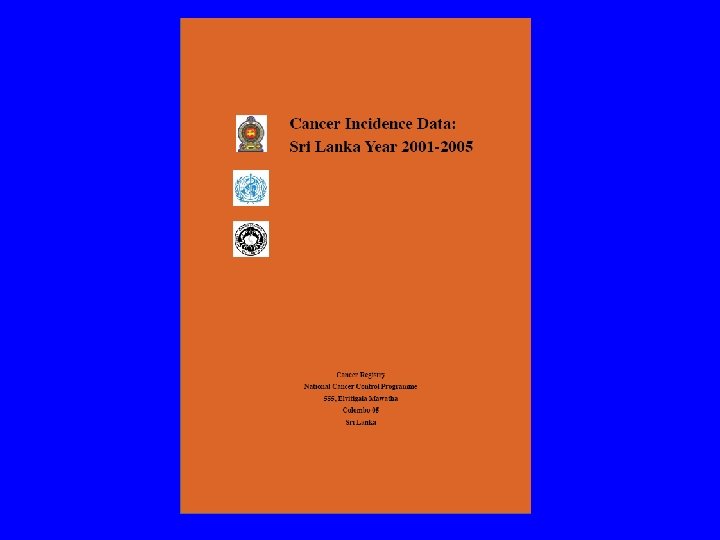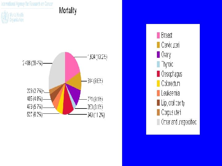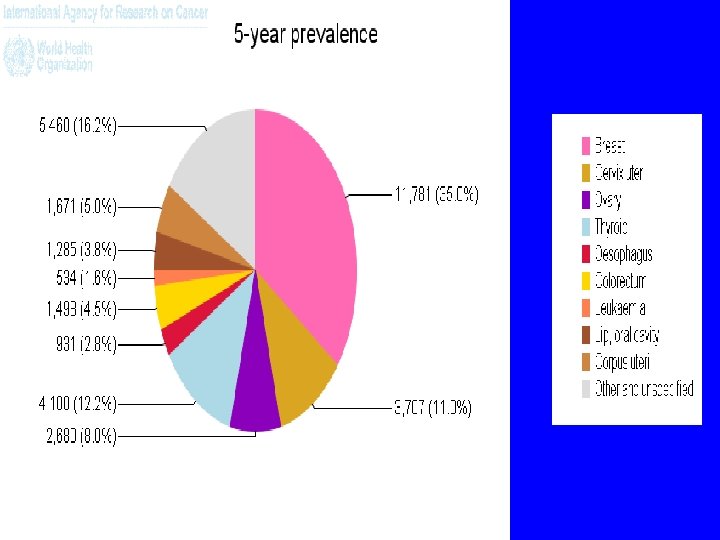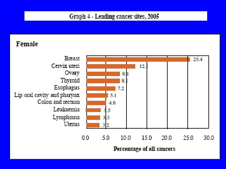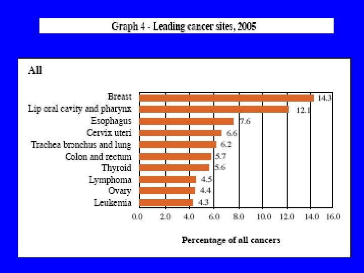 Leading Cancer sites overall (2005) All Site No CR ASR Breast 1908 9. 7 Lip Oral Cavity & Pharynx 1617 8. 2 8. 7 Esophagus 1022 5. 6 Cervix Uteri 881 4. 5 4. 6 Trachea Bronchus & Lungs 832 4. 5 Thyroid 752 3. 8 3. 6 Colon & Rectum 741 3. 8 3. 6 Lymphoma 604 3. 1 3. 3 Ovary 596 3. 0 Leukaemia 570 2. 9 3. 0 13372 67. 9 70. 6 All Sites