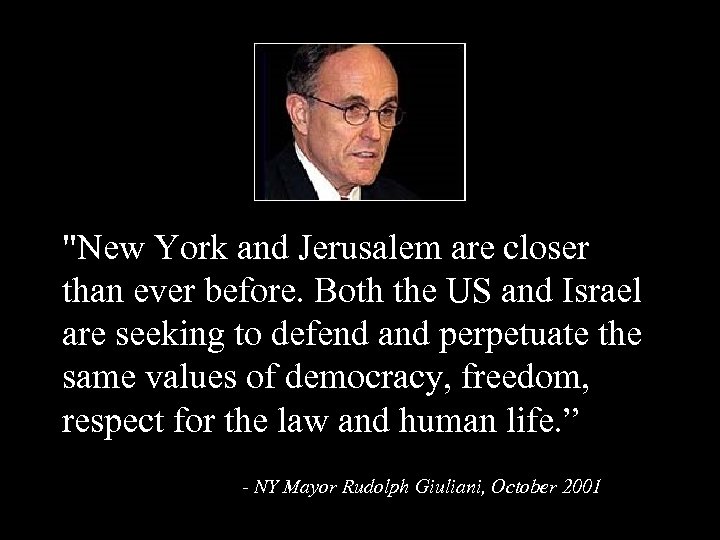 "New York and Jerusalem are closer than ever before. Both the US and Israel are seeking to defend and perpetuate the same values of democracy, freedom, respect for the law and human life. ” - NY Mayor Rudolph Giuliani, October 2001