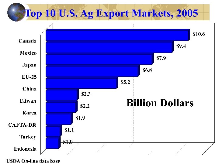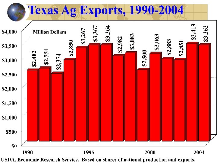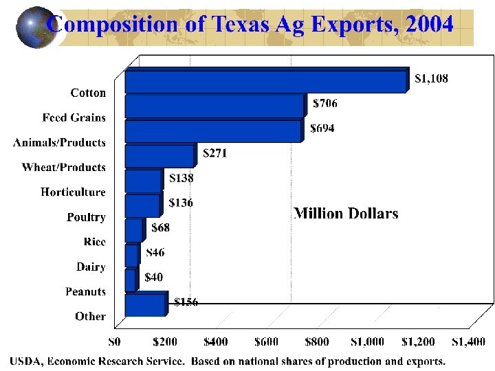 Ag Exports $3, 363 million Texas Ag Export Impacts Business Activity ($ M) $6, 558 Income ($ M) $2, 724 Jobs (#) 88, 875