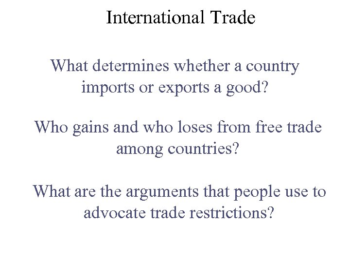 International Trade What determines whether a country imports or exports a good? Who gains and who loses from free trade among countries? What are the arguments that people use to advocate trade restrictions?