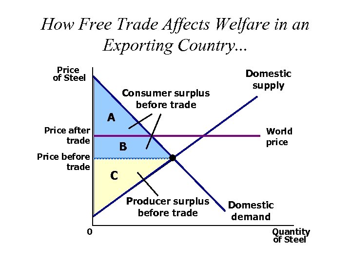 How Free Trade Affects Welfare in an Exporting Country. . . Price of Steel A Price after trade Price before trade Consumer surplus before trade B World price C Producer surplus before trade 0 Domestic supply Domestic demand Quantity of Steel