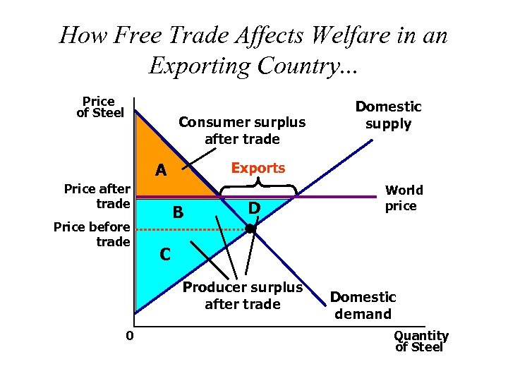 How Free Trade Affects Welfare in an Exporting Country. . . Price of Steel Consumer surplus after trade A Price after trade Price before trade Exports B D World price C Producer surplus after trade 0 Domestic supply Domestic demand Quantity of Steel