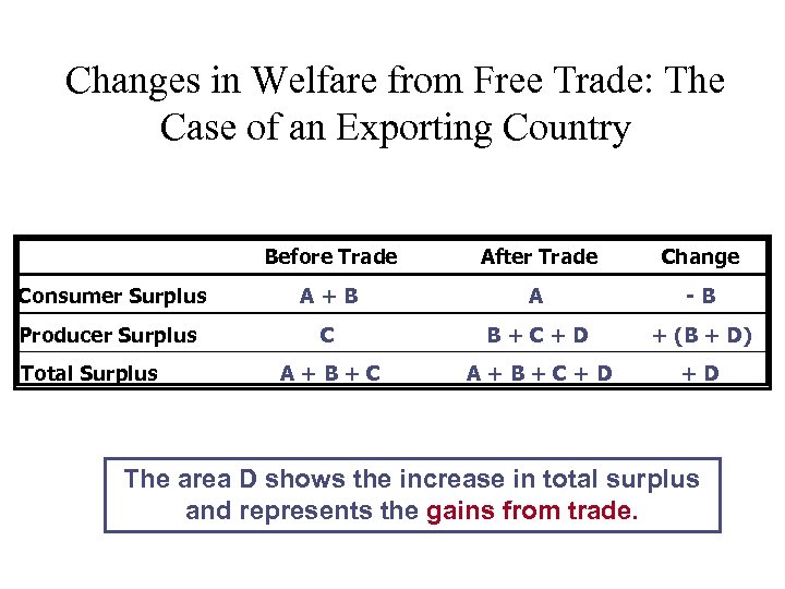 Changes in Welfare from Free Trade: The Case of an Exporting Country Before Trade After Trade Change Consumer Surplus A+B A -B Producer Surplus C B+C+D + (B + D) A+B+C+D +D Total Surplus The area D shows the increase in total surplus and represents the gains from trade.
