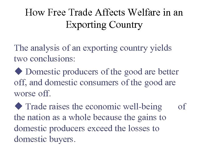 How Free Trade Affects Welfare in an Exporting Country The analysis of an exporting country yields two conclusions: u Domestic producers of the good are better off, and domestic consumers of the good are worse off. u Trade raises the economic well-being of the nation as a whole because the gains to domestic producers exceed the losses to domestic buyers.
