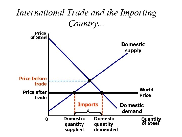International Trade and the Importing Country. . . Price of Steel Domestic supply Price before trade World Price after trade Imports 0 Domestic quantity supplied Domestic quantity demanded Domestic demand Quantity of Steel