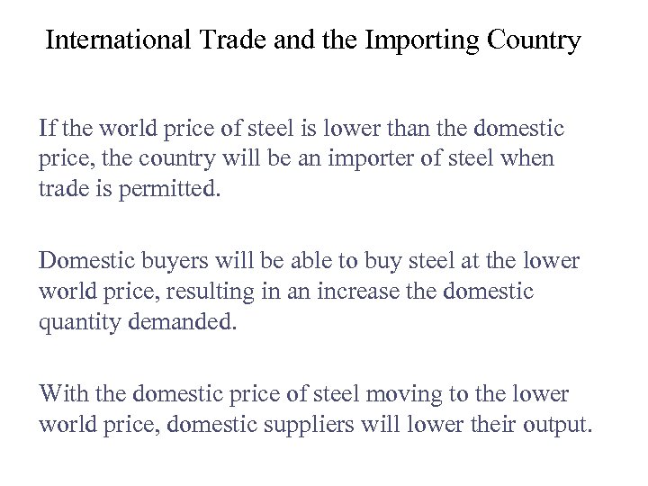 International Trade and the Importing Country If the world price of steel is lower than the domestic price, the country will be an importer of steel when trade is permitted. Domestic buyers will be able to buy steel at the lower world price, resulting in an increase the domestic quantity demanded. With the domestic price of steel moving to the lower world price, domestic suppliers will lower their output.