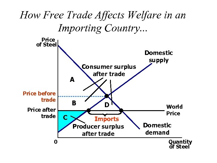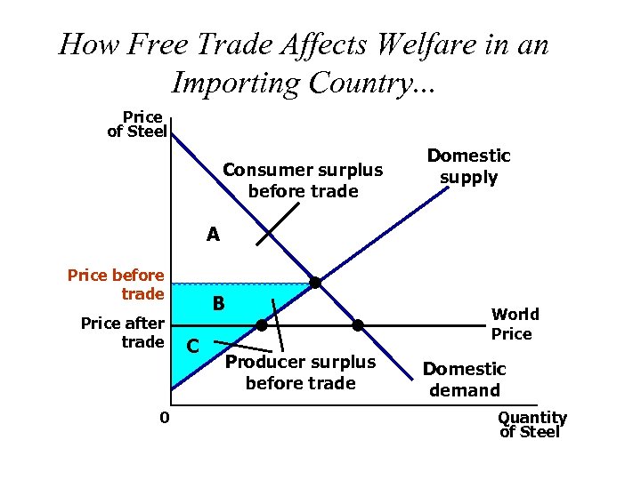 How Free Trade Affects Welfare in an Importing Country. . . Price of Steel Consumer surplus before trade Domestic supply A Price before trade Price after trade 0 B C Producer surplus before trade World Price Domestic demand Quantity of Steel