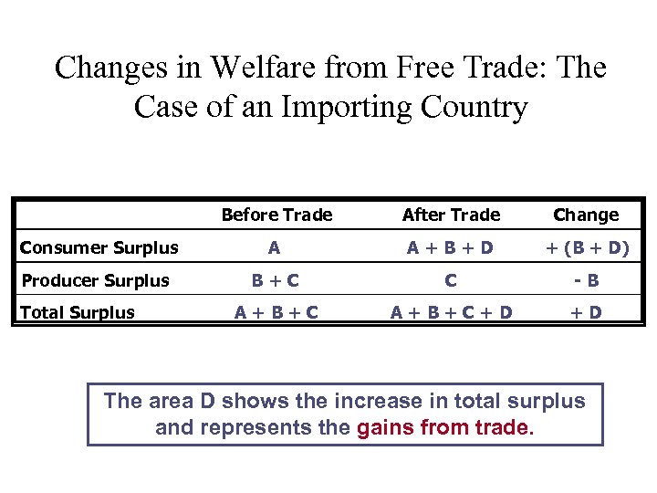Changes in Welfare from Free Trade: The Case of an Importing Country Before Trade After Trade Change Consumer Surplus A A+B+D + (B + D) Producer Surplus B+C C -B A+B+C+D +D Total Surplus The area D shows the increase in total surplus and represents the gains from trade.