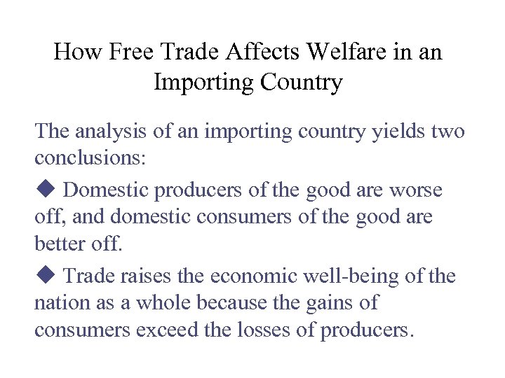 How Free Trade Affects Welfare in an Importing Country The analysis of an importing country yields two conclusions: u Domestic producers of the good are worse off, and domestic consumers of the good are better off. u Trade raises the economic well-being of the nation as a whole because the gains of consumers exceed the losses of producers.