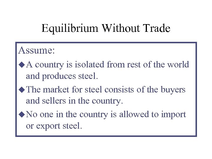 Equilibrium Without Trade Assume: u. A country is isolated from rest of the world and produces steel. u The market for steel consists of the buyers and sellers in the country. u No one in the country is allowed to import or export steel.