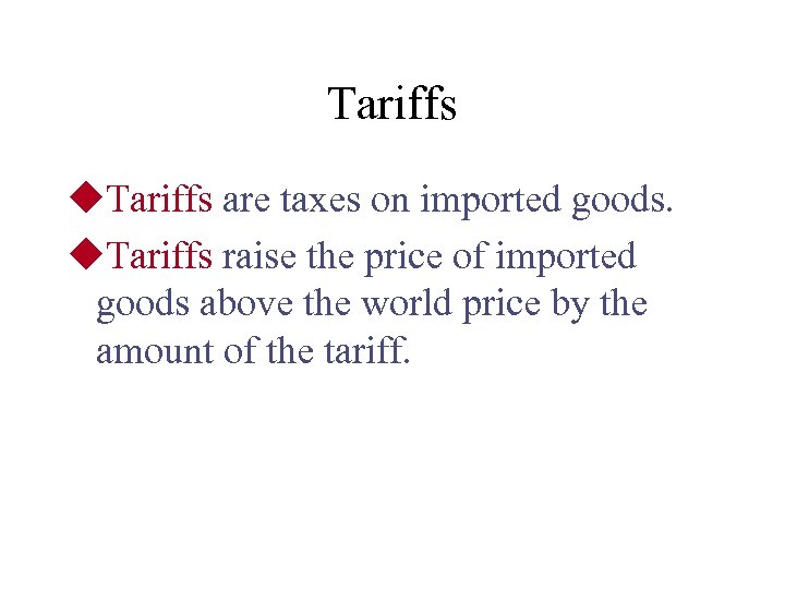 Tariffs u. Tariffs are taxes on imported goods. u. Tariffs raise the price of imported goods above the world price by the amount of the tariff.