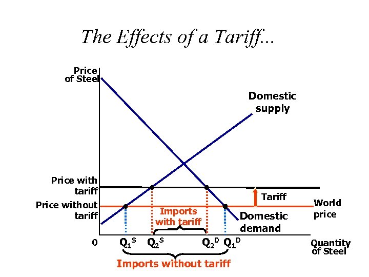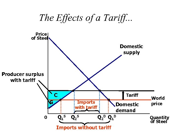 The Effects of a Tariff. . . Price of Steel Domestic supply Consumer surplus with tariff A B Price with tariff Price without tariff 0 Tariff Imports with tariff Q 1 S Q 2 S Domestic demand Q 2 D Q 1 D Imports without tariff World price Quantity of Steel