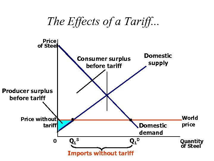 The Effects of a Tariff. . . Price of Steel Domestic supply Consumer surplus before tariff Producer surplus before tariff Price without tariff 0 Domestic demand Q 1 S Q 1 D Imports without tariff World price Quantity of Steel