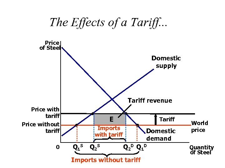 The Effects of a Tariff. . . Price of Steel Domestic supply Tariff revenue Price with tariff Price without tariff 0 E Tariff Imports with tariff Q 1 S Q 2 S Domestic demand Q 2 D Q 1 D Imports without tariff World price Quantity of Steel