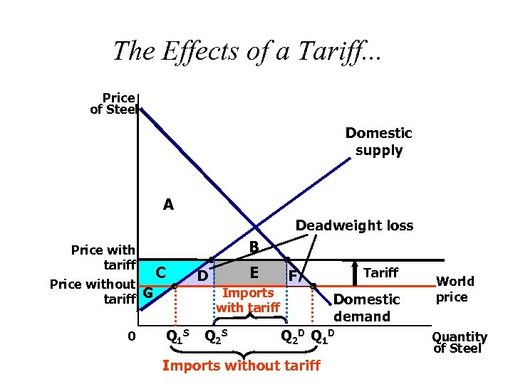 The Effects of a Tariff. . . Price of Steel Domestic supply A Deadweight loss B Price with tariff C Price without tariff G 0 D Q 1 S E Imports with tariff Q 2 S Tariff F Domestic demand Q 2 D Q 1 D Imports without tariff World price Quantity of Steel